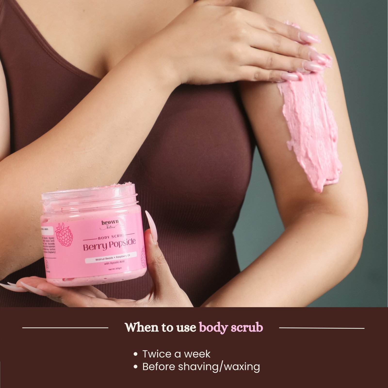Body Scrub – Scoop out some Body Scrub & apply it to wet skin. Gently scrub in circles for a few minutes, focusing on areas prone to ingrowns. Rinse off & pat dry. Use twice a week for smooth, glowing skin!